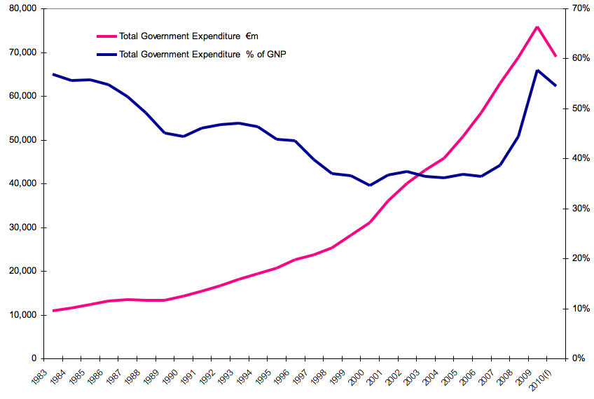 But is there any reason to think Ireland’s competitive corporate tax regime is responsible for the nation’s economic crisis? The answer, not surprisingly, is no. Here’s a chart from one of Ireland’s top economists, looking at taxes and spending for past 27 years. You can see that revenues grew rapidly, especially beginning in the 1990s as the lower tax rates were implemented. The problem is that politicians spent every penny of this revenue windfall.