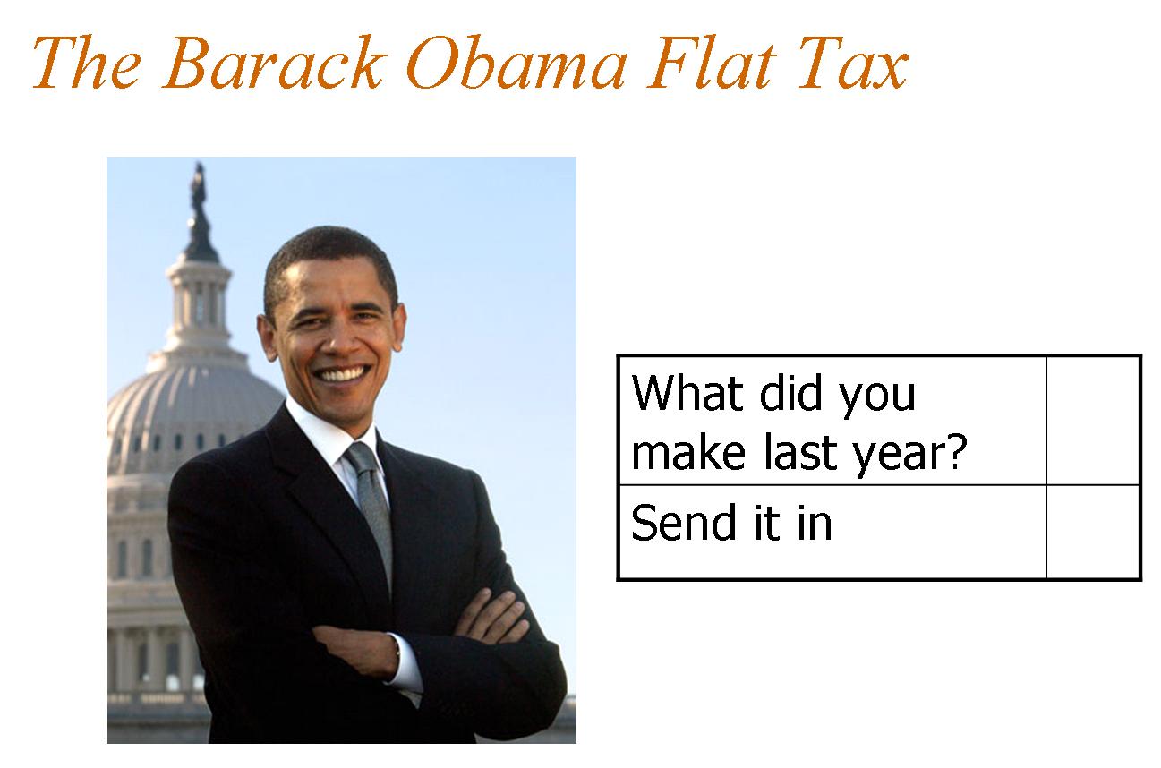 In my fiscal policy speeches, I sometimes try to get a laugh out of audiences by including a Powerpoint slide with this image. Leading up to this slide, I talk about the Armey/Forbes flat tax and explain that it would eliminate the corrupt internal revenue code and replace it with a simple 10-line postcard. But I then warn that simplicity is not the same as low taxes and show the Obama slide.