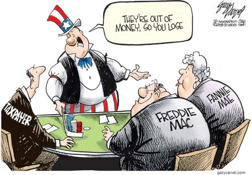 This cartoon is not new, but it succinctly captures what happened with that part of the TARP bailout. The only thing missing is some way of showing the government officials and political insiders who received undeserved wealth while the Fannie-Freddie scam was operating.