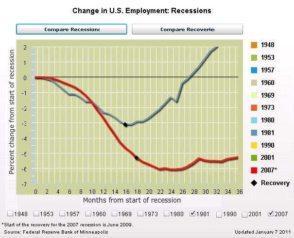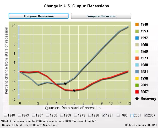 The Federal Reserve Bank of Minneapolis has a fascinating (at least for economic geeks) interactive webpage that allows readers to compare economic downturns and recoveries, both on the basis of output and employment.