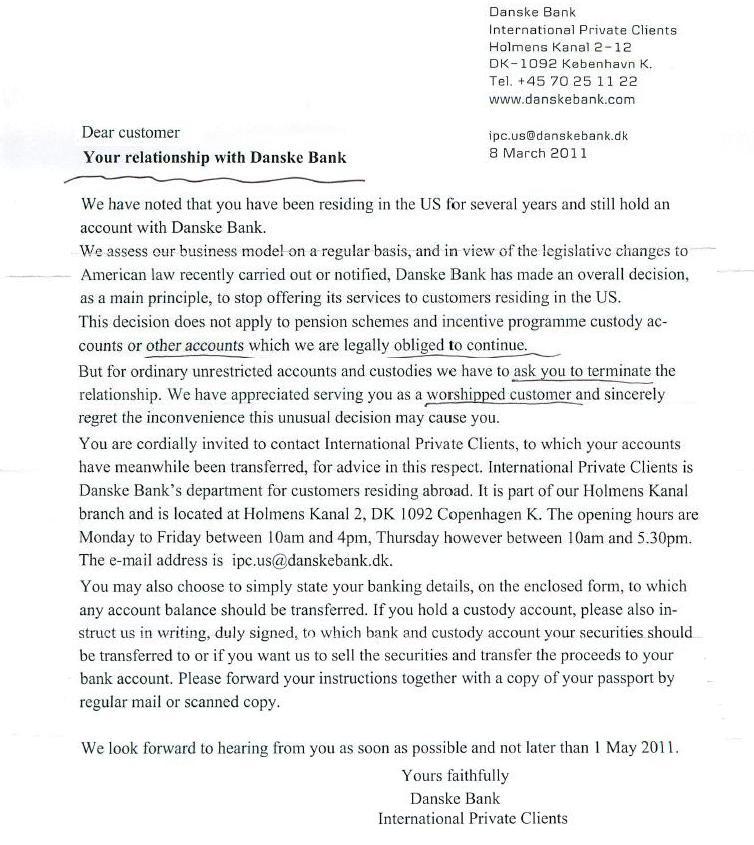 Let’s close this lengthy post by including this letter from a Danish bank to a Danish citizen living in the United States. Once again, identifying information is redacted because the person did not want to suffer IRS persecution (it should disturb all of us, by the way, that there is such universal fear of IRS thuggery).