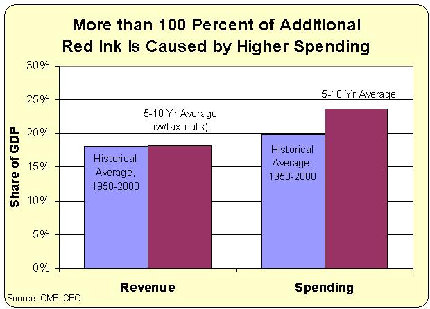 Tax revenues will be 18.2 percent of GDP, slightly higher than their historical average of 18.0 percent of economic output. So we can safely conclude that revenues in general (and “unaffordable tax cuts” in particular) are not responsible for higher levels of red ink.