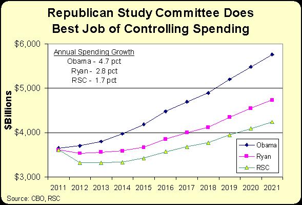 If the goal is to restrain government, the RSC blueprint is the best of all worlds. As the chart illustrates, government only grows by an average of 1.7 percent annually with that plan, compared to an average of 2.8 percent growth under Ryan’s good budget and 4.7 percent average growth with Obama’s head-in-the-sand proposal.
