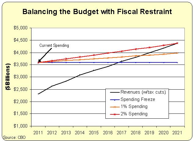The numbers show that a spending freeze balances the budget by 2017. Red ink disappears by 2019 if spending is allowed to grow 1 percent each years. And the deficit disappears by 2021 if spending is limited to 2 percent annual growth.