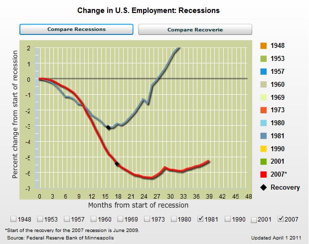 But is it an accurate argument? Since there’s no parallel universe where we can conduct policy experiments, there’s no way of proving which side is wrong. Nonetheless, this chart from the Minneapolis Federal Reserve Bank is rather revealing. It compares employment numbers after the deep recession of the early 1980s with the employment numbers from the recent deep recession.