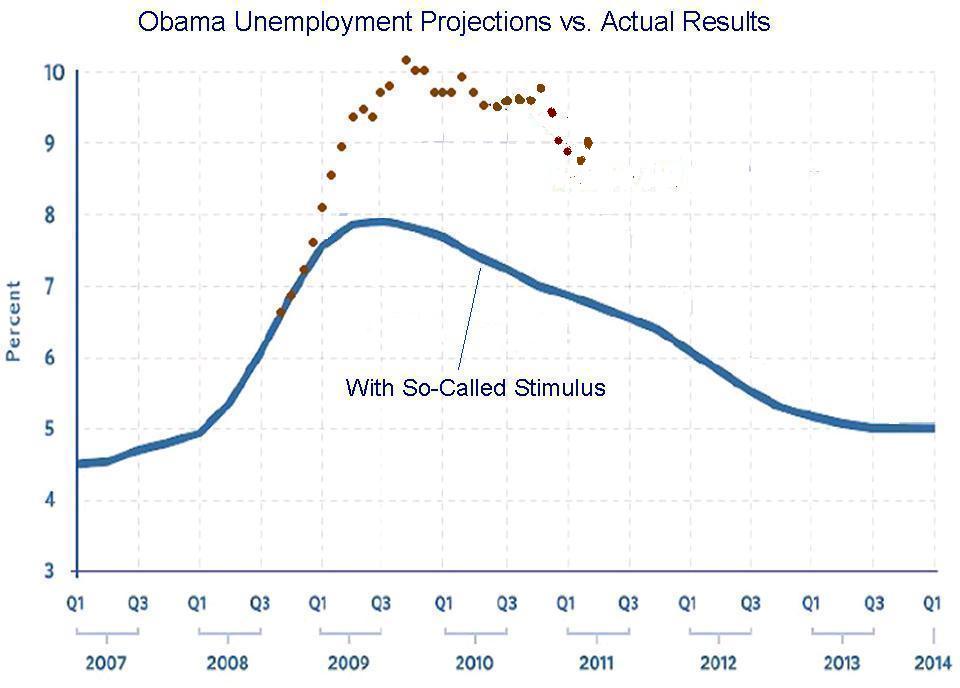 The blue line in this chart shows the Administration’s prediction of what would happen to unemployment if the so-called stimulus was enacted. The dots represent the actual unemployment rate.