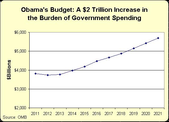 Second, the slope of the line if the graph is very revealing. The first two years look very impressive, with almost no change in spending, but the goal of fiscal policy, to borrow a phrase from the health care debate, should be “bending the cost curve” of government. Short-run gimmicks, to put it mildly, don’t have any long-run impact. That’s why the most important number in Obama’s budget is the $5.7 trillion burden of spending in 2021. That’s a mark of fiscal failure, and it exists because Obama’s budget increases spending at twice the rate of inflation between 2013 and 2021.