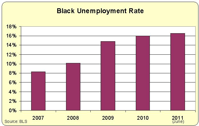 The unemployment data also shows bad news for blacks. This chart uses data from the Bureau of Labor Statistics and it shows unemployment among African-Americans has nearly doubled in recent years.