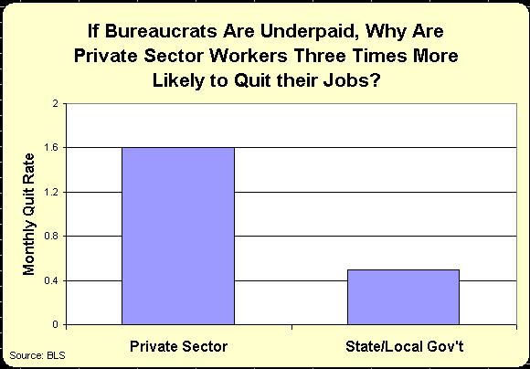 Not surprisingly, this data shows state and local bureaucrats are living on Easy Street. As the chart illustrates, private sector workers are more than three times as likely to quit their jobs.