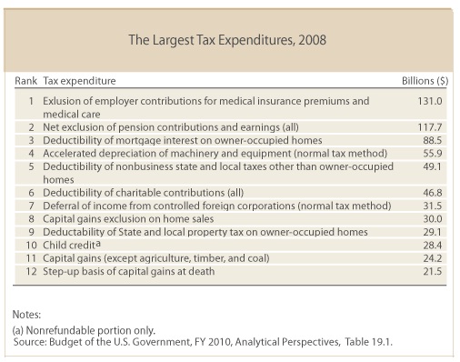 The bad news is that these provisions get added to “tax expenditure” lists, and therefore get mixed up with the provisions that provide special tax breaks. This may sound too strange to be true, but here’s a list of the biggest so-called tax expenditures from the Tax Policy Center (which is a left-leaning organization, but their numbers are basically the same as the ones found at the Joint Committee on Taxation).