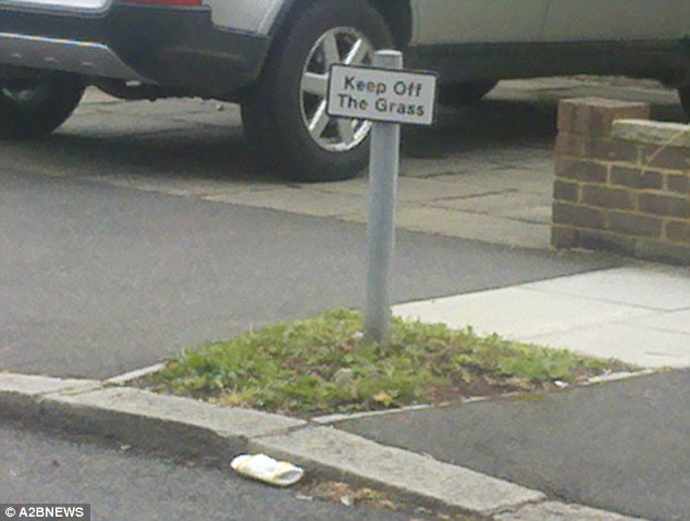 stopped one town hall making a great deal of fuss about it. The verge measures only 3ft by 2ft but has its own ‘Keep Off The Grass’ sign. The warning has appeared as officials plan £70million of cuts. Resident Tom Beardmore, 29, said he was ‘flabbergasted’ when he saw it in Raynes Park, south-west London. …A council spokeswoman said the matter was being looked into but was unable to confirm how much the sign had cost or why it was placed there.