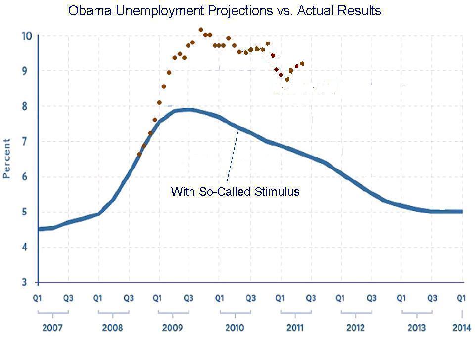 The unemployment numbers released today certainly will not be easy to spin. Here’s the chart I periodically update, showing the actual unemployment rate compared to what the White House claimed would happen if we flushed $800 billion down the Washington rathole.