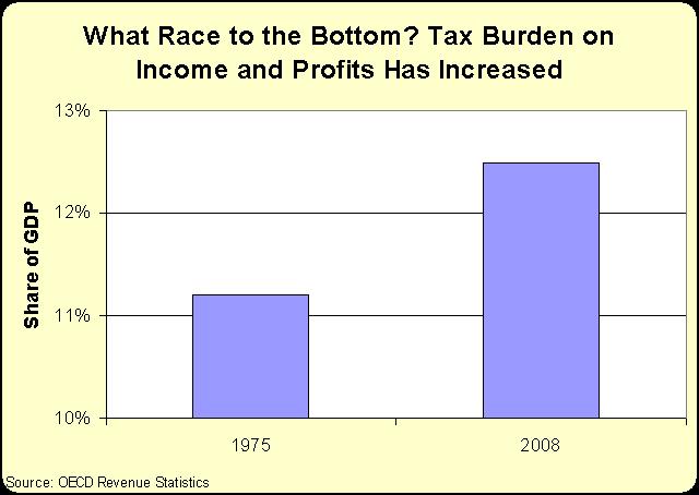 This chart, showing the average for industrialized nations, shows that Sachs and his ilk are wrong. Way wrong. Tax rates have come down, but the overall tax burden actually has increased. So while there may be a race to less-destructive tax rates, there certainly isn’t a race to bottom for tax revenue.
