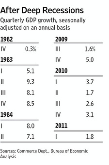 This image, taken from an op-ed in today’s Wall Street Journal, shows quarterly economic growth (adjusted for inflation) for the seven quarters after the recession ended.