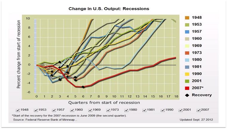 Previously, I’ve compared Obamanomics and Reaganomics, but this image may be even better because it shows all business cycles and confirms that the Obama years have been the worst in post-World War II history.