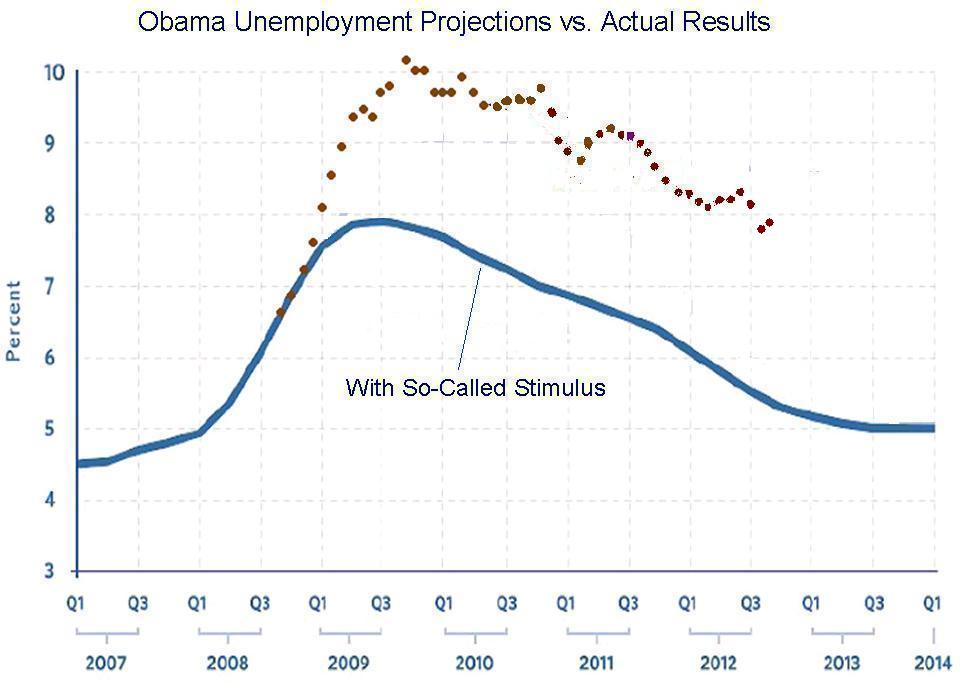 We’ll start with a chart showing what President Obama claimed would happen to unemployment if we enacted his so-called stimulus compared to the actual real-world results.