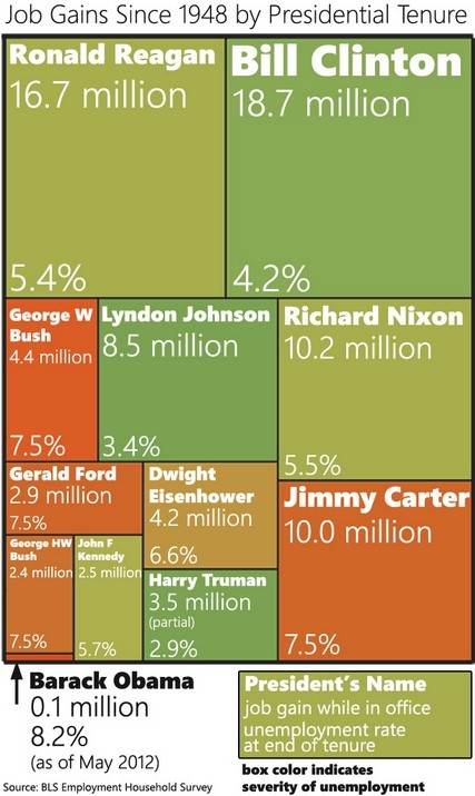 The numbers released this morning from the Department of Labor don’t change the narrative. The Republican and Democratic spin-doctors obviously will spit out their talking points, but here’s a visual put together by Political Math that trumps all the political maneuvering. If you’re wondering where Obama is, look at the lower left portion of the image.