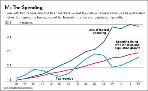 President Obama says he wants a “balanced” approach to the fiscal cliff. But critics argue the real problem is spending, which has far outstripped rising tax revenue as well as economic growth. Federal government revenue rose from $1.7 trillion to $2.4 trillion from fiscal 1998 to 2012, slightly exceeding inflation. Revenue growth averaged 2.9% annually, despite two recessions, bear markets — and tax cuts. But federal spending rose nearly twice as fast — 5.7% per year — surging from $1.6 trillion to $3.5 trillion over that same span. The spending spike also exceeds growth in the population.