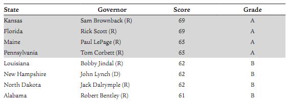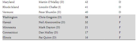 No Republican was in the bottom 8, but Bill Haslam of Tennessee was in the bottom 10, and Gary Herbert of Utah and Jan Brewer of Arizona also had dismal D grades.