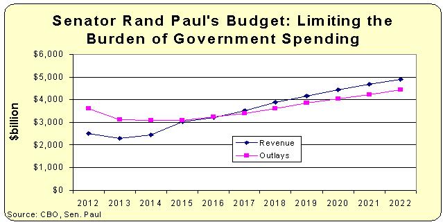 The accompany chart shows the 10-year projections for spending and revenue if Senator Paul’s budget is enacted.