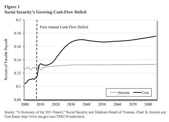 The chart shows big funding shortfalls, particularly once the baby boomers have retired. Most people, though, aren’t familiar with concepts such as “percent of taxable payroll.”