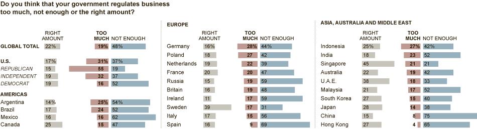 I’m not sure, though, how to react to this latest survey data. Published in the New York Times, it shows widespread global support for more regulation. Here are the results (click the image to enlarge).