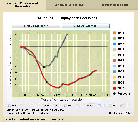 While that chart is probably embarrassing to the White House, I think the most revealing numbers come from the Minneapolis Federal Reserve Bank’s interactive website, which allows users to compare employment data and GDP data for different business cycles.