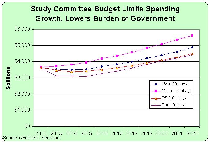 After the initial period of spending restraint, the budget would be allowed to grow, but only about as fast as the private economy. This chart shows spending levels for the Obama budget, the Paul Ryan budget, the Rand Paul budget, and the RSC budget.