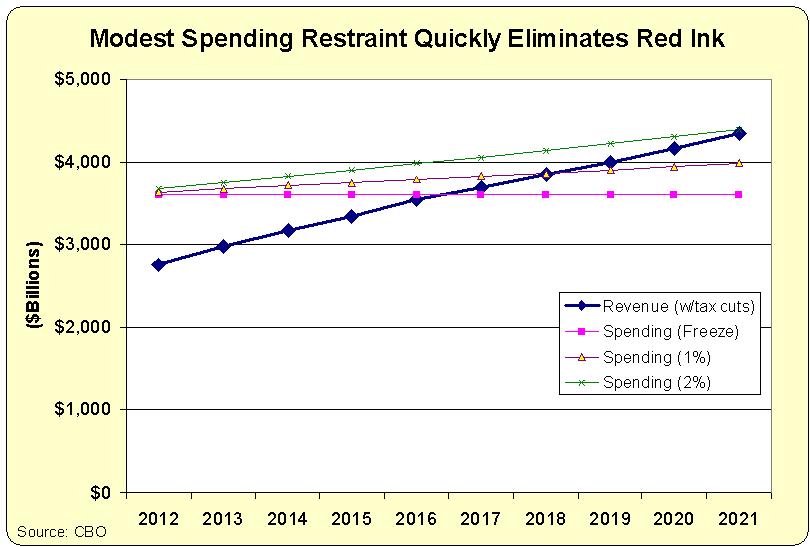 Even if we assume that the 2001 and 2003 tax cuts are made permanent, all that is needed is for politicians to put government on a modest diet so that overall spending grows by about 2 percent each year. In other words, make sure the budget doesn’t grow faster than inflation.