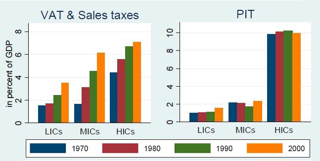 These charts are taken from page 10 of the IMF study and they depict changes, over the past several decades, for both personal income tax (PIT) revenues and consumption tax revenues, both measured as a share of economic output. The charts are divided to show trends in low-income countries, middle-income countries, and high-income countries.