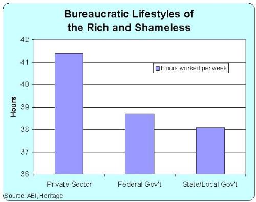 …overstaffing is a serious problem in government, and the best evidence is a simple empirical fact: Government employees don’t work as much as private employees. …new evidence from a comprehensive and objective data set confirms that the “underworked” government employee is more than a stereotype. …The time-use survey’s data on work time…allow us to analyze both the number of hours individuals work during a typical workweek and the total number of hours they work during the year. …What we found was that during a typical workweek, private-sector employees work about 41.4 hours. Federal workers, by contrast, put in 38.7 hours, and state and local government employees work 38.1 hours. …Put another way, private employees spend around an extra month working each year compared with public employees.
