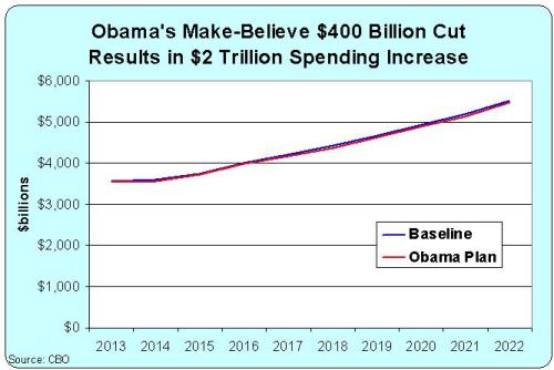 The President is not proposing to cut spending by $400 billion. He’s only proposing to reduce future spending growth by that amount. In other words, his “spending cut” is only a cut if you play the dishonest DC game of measuring “cuts” against a baseline of ever-expanding government.