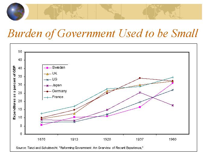 This slide shows that government spending used to consume only about 10 percent of European economic output in the 1800s and less than 15 percent of GDP as late as 1913.
