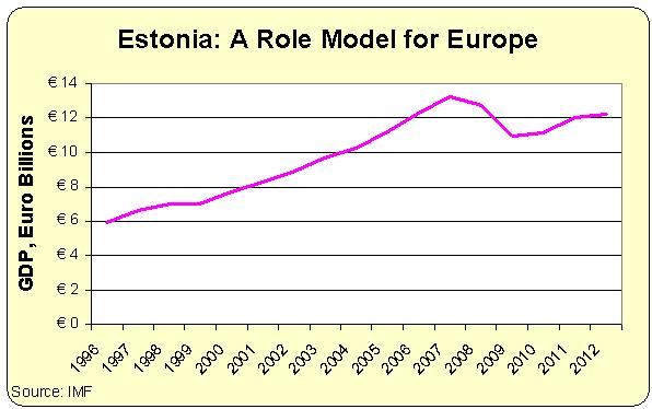 Sixteen months after it joined the struggling currency bloc, Estonia is booming. The economy grew 7.6 percent last year, five times the euro-zone average. Estonia is the only euro-zone country with a budget surplus. National debt is just 6 percent of GDP, compared to 81 percent in virtuous Germany, or 165 percent in Greece. Shoppers throng Nordic design shops and cool new restaurants in Tallinn, the medieval capital, and cutting-edge tech firms complain they can’t find people to fill their job vacancies. It all seems a long way from the gloom elsewhere in Europe. Estonia’s achievement is all the more remarkable when you consider that it was one of the countries hardest hit by the global financial crisis. …How did they bounce back? “I can answer in one word: austerity. Austerity, austerity, austerity,” says Peeter Koppel, investment strategist at the SEB Bank. …that’s not exactly the message that Europeans further south want to hear. …Estonia has also paid close attention to the fundamentals of establishing a favorable business environment: reducing and simplifying taxes, and making it easy and cheap to build companies.