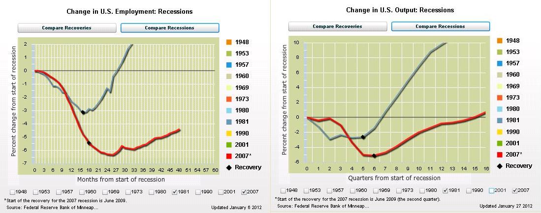 Here are two graphs, which I posted earlier this month, that make my point. The red lines show the economy is finally – and slowly – moving in the right direction, but the blue lines show how the economy boomed under Reaganomics.
