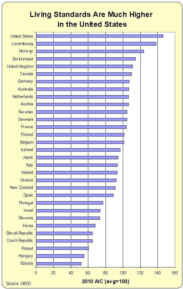With that being said, let’s look at some truly remarkable statistics from the OECD website on comparative living standards in industrialized nations. This chart shows average levels of individual consumption (AIC) for 31 OECD countries. There are several possible measures of prosperity, including per-capita GDP. All are useful, but AIC is thought to best capture the well-being of a people.