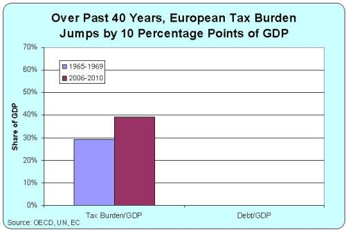 Let’s start with this chart I put together after digging through historical data from the United Nations, European Commission, and Organization for Economic Cooperation and Development. It shows tax burden for the 15 nations of the pre-2004-expansion European Union, minus Luxembourg which didn’t collect this kind of data in the 1960s. Basically, we’re looking at the average tax burden in Western Europe for 1965-1969 and for 2006-2010.