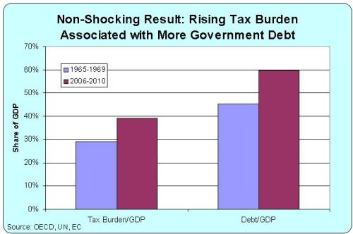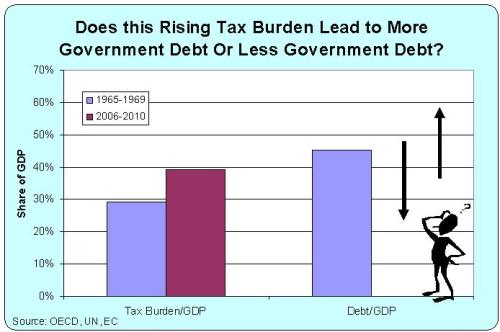 This second chart looks at the burden of government debt, which averaged 45 percent of GDP for the 1965-1969 period. And we see a stick figure wondering whether the debt for 2006-2010 will be higher or lower. In other words, did politicians use the additional revenue to pay down the debt, did they spend it, or did they spend all the added revenue and then borrowed even more?
