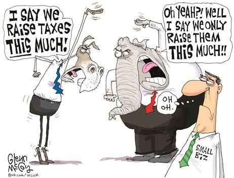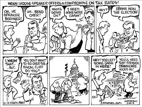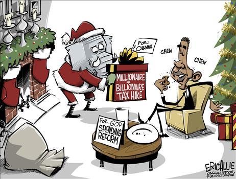 At the beginning of the month, I posted a bunch of cartoons that portrayed Obama as being very dogmatic and inflexible in the negotiations, while showing Republicans as being clueless and naive. Well, here’s another one with the same message.