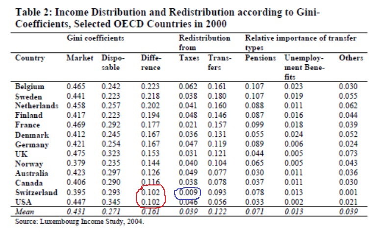 I can’t resist sharing one additional bit of information from the Feld-Schnellenbach paper. They compare redistribution in several nations. As you can see in the table reproduced below, the United States and Switzerland benefit from having the lowest levels of overall redistribution (circled in red).