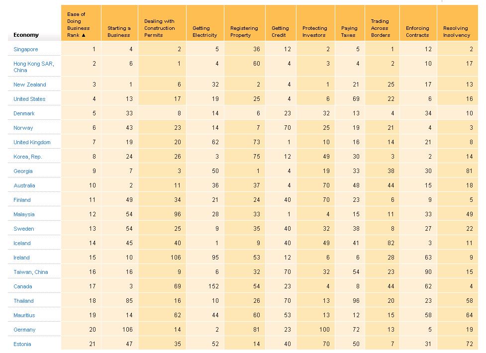 One very good source of data from an international bureaucracy is the Doing Business Index, published each year by the World Bank. As you can see from the image (click to enlarge), the United States does relatively well in this ranking.