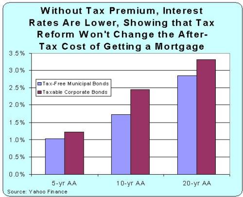 They made a contract under the old rules and shouldn’t have the rug pulled out from under them. - Second, people taking out new mortgages would benefit since mortgage interest would get the same tax treatment now reserved for tax-free municipal bonds. And because there’s no federal income tax on municipal bonds, that means there’s no tax wedge built into the interest rate.