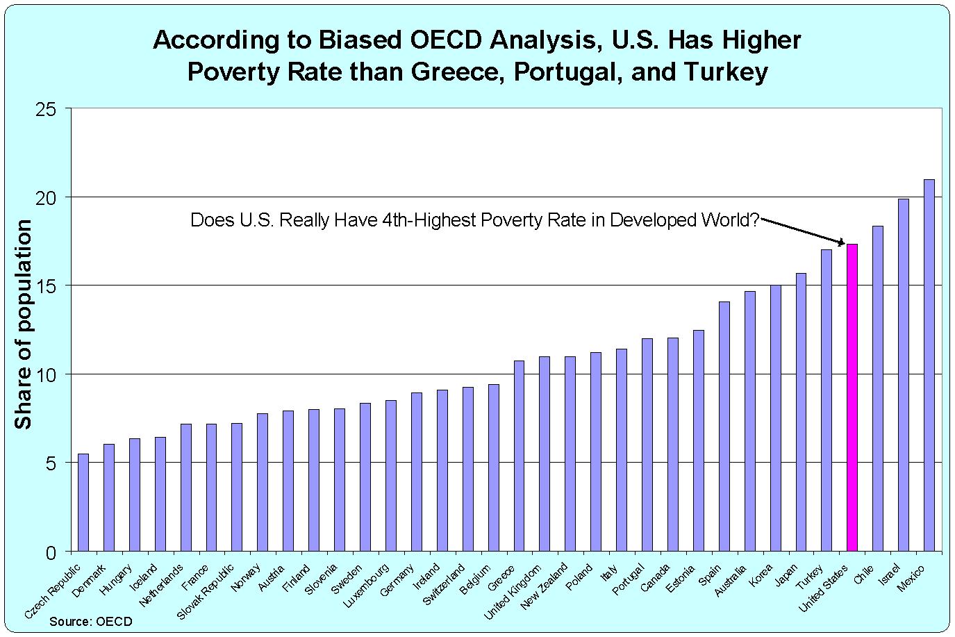 With this dismal track record, you probably won’t be surprised to learn that the Paris-based bureaucracy has a new propaganda initiative that seeks to bolster a left-wing redistribution agenda. And as part of this new scheme, it has put together numbers that supposedly show that there is more poverty is the United States than there is in bankrupt and backwards nations such as Greece, Hungary, Portugal, and Turkey.