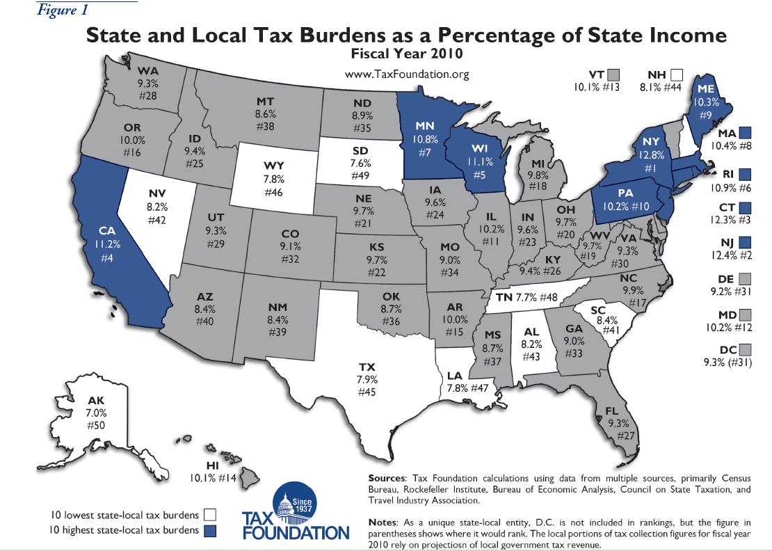 More specifically, 7 of the non-income tax states are among the 10 states with the lowest tax burdens. Only Florida and Washington are outside the top 10.