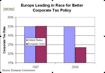 And even if it worked perfectly, America’s high corporate tax rate still puts U.S. companies in a very disadvantageous position. If an American firm, Dutch firm, and Irish firm are competing for business in Ireland, the latter two only pay the 12.5 percent Irish corporate tax on any profits they earn. The U.S. company also pays that tax, but then also pays an additional 22.5 percent to the IRS (the 35 percent U.S. tax rate minus a credit for the 12.5 percent Irish tax).