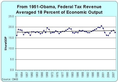 Here’s a chart I made. It’s not as fancy, but it shows tax revenue for the last 50 years of the 20th Century, plus the years leading up to Obama this century. The average is exactly 18.0 percent, with a slight upward trajectory according to the Excel auto-trendline feature.