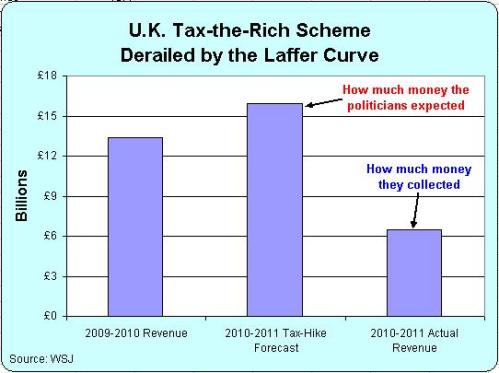 Here’s a chart showing what happened in the U.K. It shows tax revenue for the 2009-2010 fiscal year, followed by a projection for 2010-2011, and then the real-world numbers.