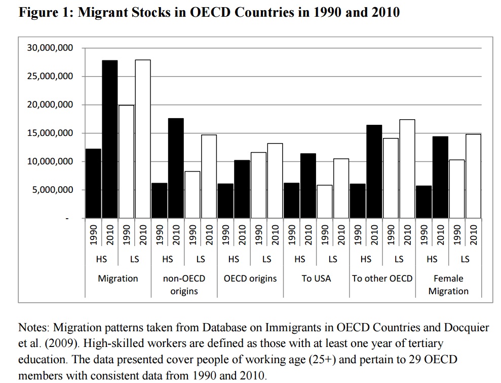 Observed migration flows are the result of a complex tangle of multinational firms and other employers pursuing scarce talent, governments and other gatekeepers trying to manage these flows with policies, and individuals seeking their best options given the constraints imposed upon them. …The number of migrants with a tertiary degree rose nearly 130 percent from 1990 to 2010, while low skilled (primary educated) migrants increased by only 40 percent during that time. A pattern is emerging in which these high-skilled migrants are departing from a broader range of countries and heading to a narrower range of countries—in particular, the United States, the United Kingdom, Canada, and Australia. …More than half of the high-skilled technology workers and entrepreneurs in Silicon Valley are foreign-born. …host countries may end up with high concentrations of high-skilled immigrants in particular occupations. For example, immigrants account for some 57 percent of scientists residing in Switzerland, 45 percent in Australia, and 38 percent in the United States (Franzoni et al. 2012).
