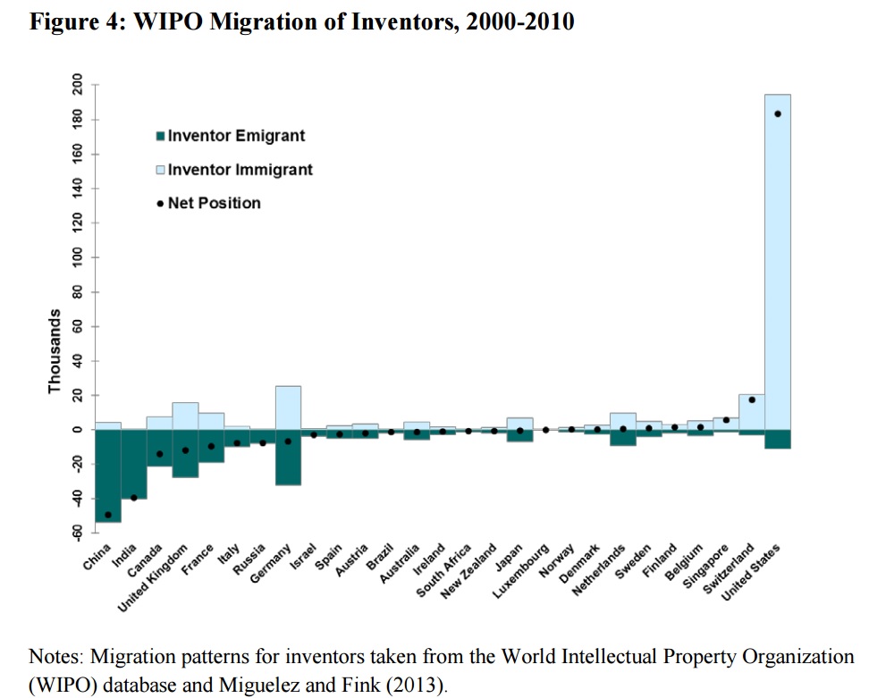 In the United States, 27 percent of all physicians and surgeons and over 35 percent of current medical residents were foreign born in 2010. Immigrants also accounted for over 35 percent of recent enrollments in STEM fields, with very high proportions in specific areas like Electrical Engineering (70 percent), Computer Science (63 percent) and Economics (55 percent)… The global migration of inventors and the resulting concentration in a handful of countries have been particularly well documented. …the global migration rate of inventors in 2000 stood at 8.6 percent, at least 50 percent greater in share terms than the average for high-skilled workers as a whole. Figure 4 builds on WIPO global patent filings from 2001-2010. The United States has received an enormous net surplus of inventors from abroad.