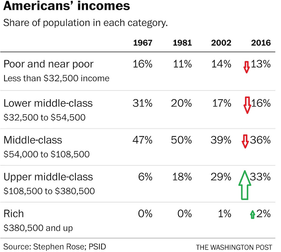And I’ve augmented the table with some arrows to call attention to what’s happened in the 50 years between 1967 and 2016. The bottom line that America now has fewer lower-income and middle-income people and a lot more upper-income people.